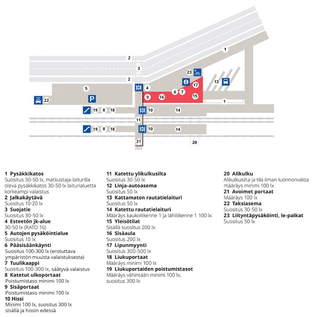 Kaaviokartta asema-alueen valaistusvoimakkuuksista. Kaavioon on yhdistetty seuraavat lähteet: määräykset ”Henkilöliikennepaikkojen kehittämisohjelma, Väliraportti 2010, Liikennevirasto” sekä ohjeet: ”Esteetön valaistus ja selkeät kontrastit, Liikenne- ja viestintäministeriön julkaisuja 39/2006″