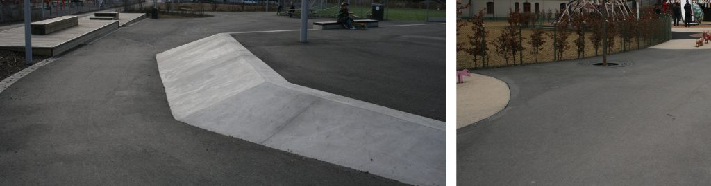 Asfalttia käytetään myös puistojen päällystemateriaalina. Esteetön pinta mahdollistaa monenlaiset leikit. Parhaimmillaan asfaltti korostaa muiden päällysteiden värejä ja struktuureja. Kuvat: Hanna Hannula.
