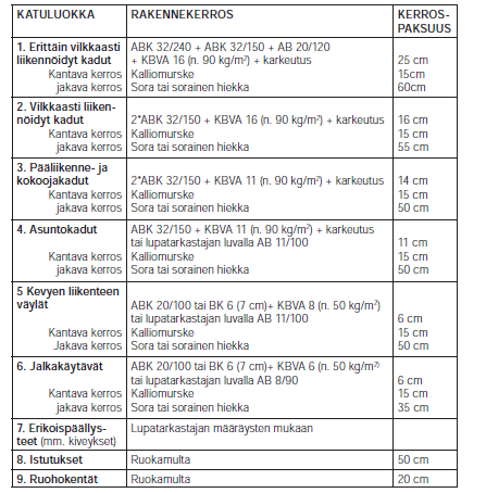 - Helsingin katurakenteiden ja vesihuoltoverkostojen suunnitteluperiaatteet., 2.8.2 Asfalttipäällysteet. Katu- ja puisto-osasto 1.10.2008.