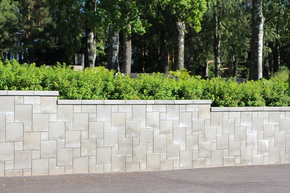 Oikealla: Betonielementtirakenteinen muuri, jossa kivilaatat on asennettu elementtivaluun.