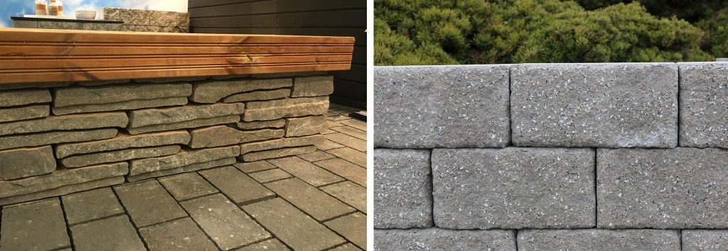 Kuvat: Rudus. Vasemmalla mataliin muureihin ja reunuksiin soveltuva Rusikko. Istuinpinnaksi tarkoitettu puuosa on painekyllästettyä terassilautaa. Oikealla Antikko muurikivestä rakennetun muurin julkisivuun tuo eloa profiloitu, epätasainen pinta. Antikon suositeltu maksimikorkeus on 70 cm.
