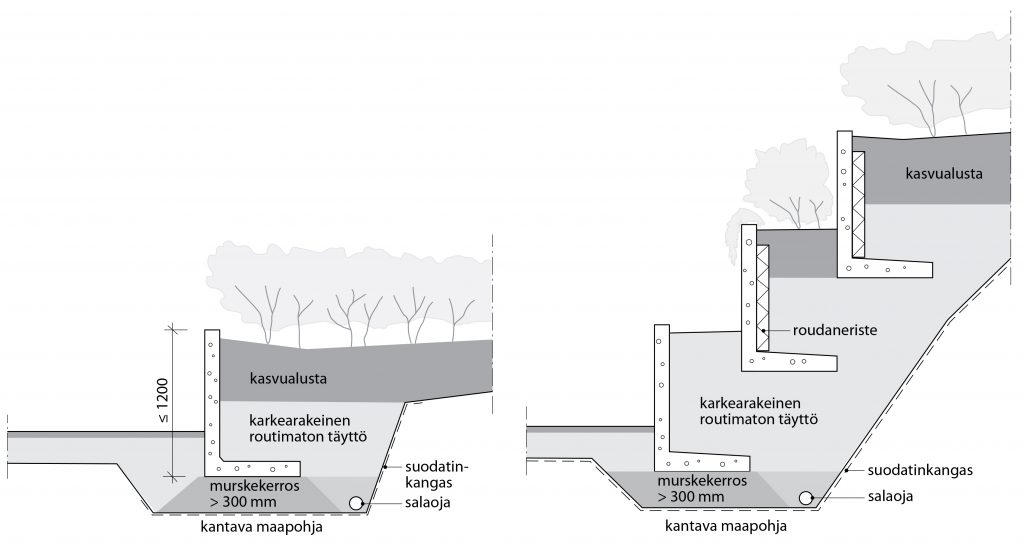 Vasemmalla matala elementtitukimuuri (L-tukimuuri), oikealla porrastetut tukimuurit.