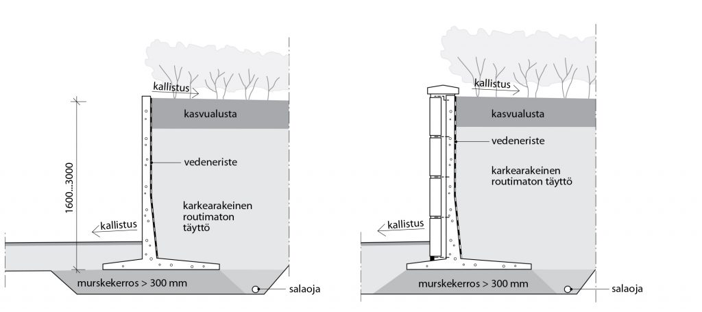 Vasemmalla korkea elementtitukimuuri (suurtukimuuri), oikealla verhottu elementtitukimuuri.