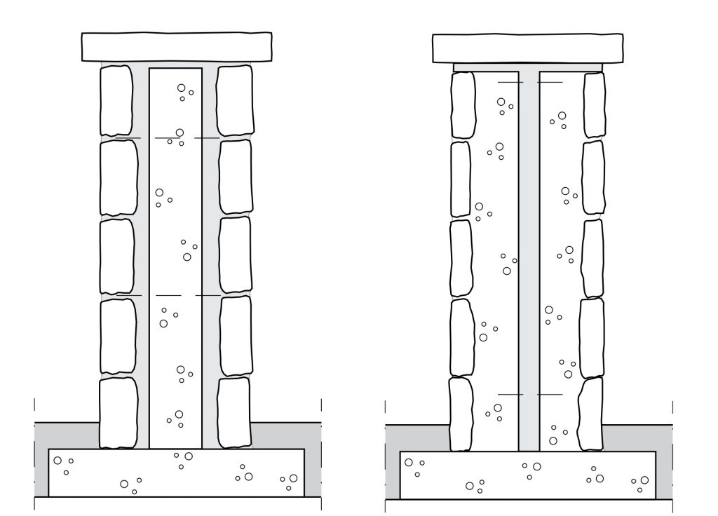 Vasemmalla: Muurin runkona on teräsbetonirakenne, johon luonnonkiviverhous sidotaan teräksillä.