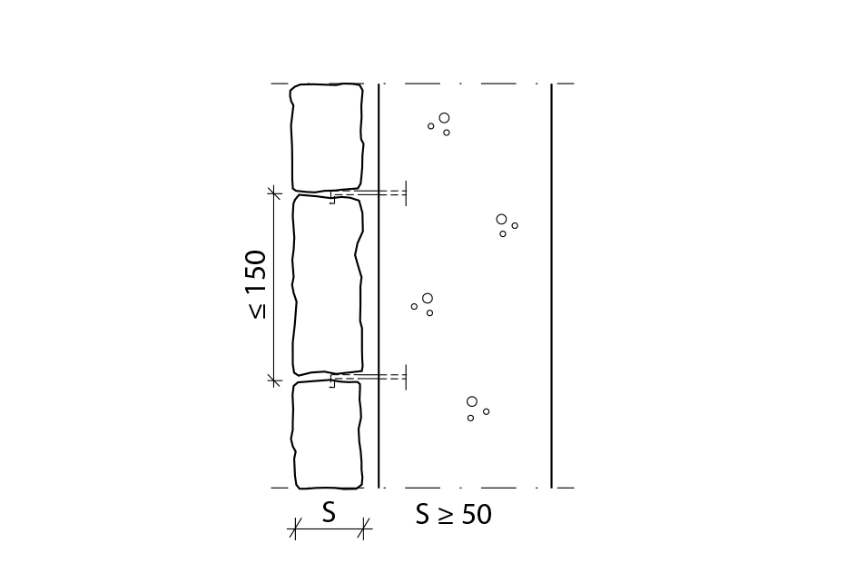 Rakennepoikkileikkaus luonnonkiviverhouksesta. Luonnonkiviverhous kiinnitetään verhottavaan rakennusosaan ja verhouskivet toisiinsa kiinnikkeillä, kannattimilla tms. Verhous on tällöin yleensä tasapaksu.