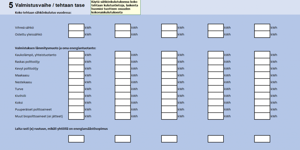- Tuotetta valmistavan tehtaan energiankulutus (sähkö ja lämmitys)