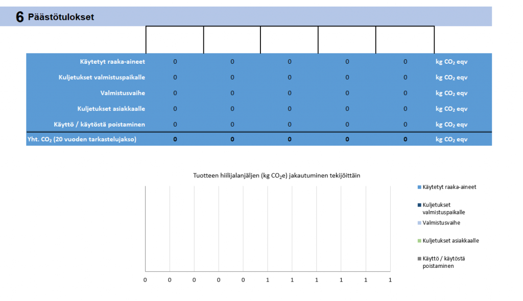 - Myös tuotteen käyttöikä vaikuttaa laskentatulokseen. Helsingin kaupunki on määritellyt tuotteille käyttöikävaatimukset, joihin valmistajan antamia tietoja verrataan