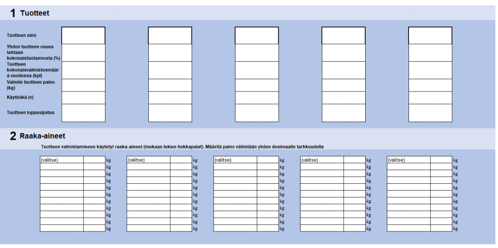 - Tuotteen valmistukseen käytetyt raaka-aineet (kg)