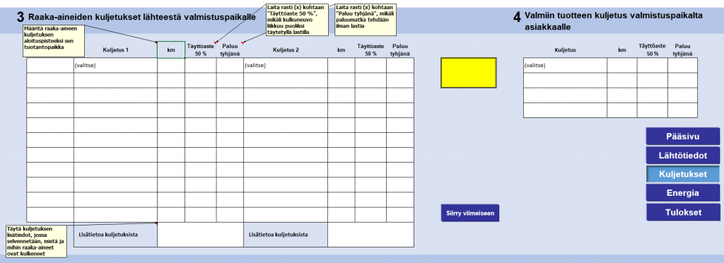 - Kuljetuksien osalta huomioidaan kuljetusvälinetyyppi (vaihtoehdot VTT:n Lipasto-palvelun mukaan), kuljettava matka (km) ja kuljetusvälineen täyttöaste sekä kuljetettaessa tuotetta määränpäähän että palattaessa takaisin