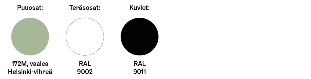 Kaikki alueet: Puuosat: 172M, vaalea Helsinki-vihreä Teräsosat: RAL 9002, Grey White Kuviot: RAL 9011, Graphite Black