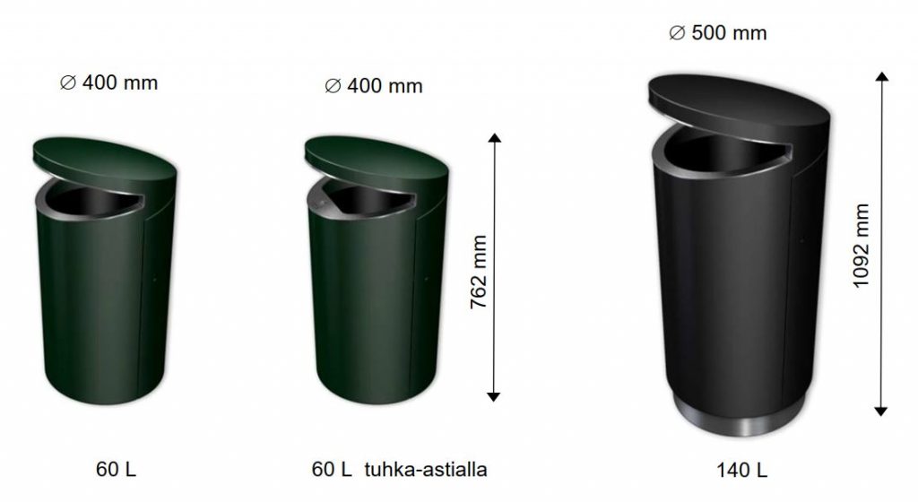 Mallitiedot: Teräksestä valmistettu roska-astiasarja katu- ja viheralueille. Roska-astia voidaan vaihtoehtoisesti varustaa magneettilukolla. Mallit ovat Helsingin kaupungin omat. Sarja on mallisuojattu.