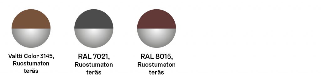 Kivikaupunki: Valltti Color 3145, (Tikkurila) ruostumaton teräs, RAL 7021, Black Grey ruostumaton teräs, RAL 8015, Chestnut Brown ruostumaton teräs