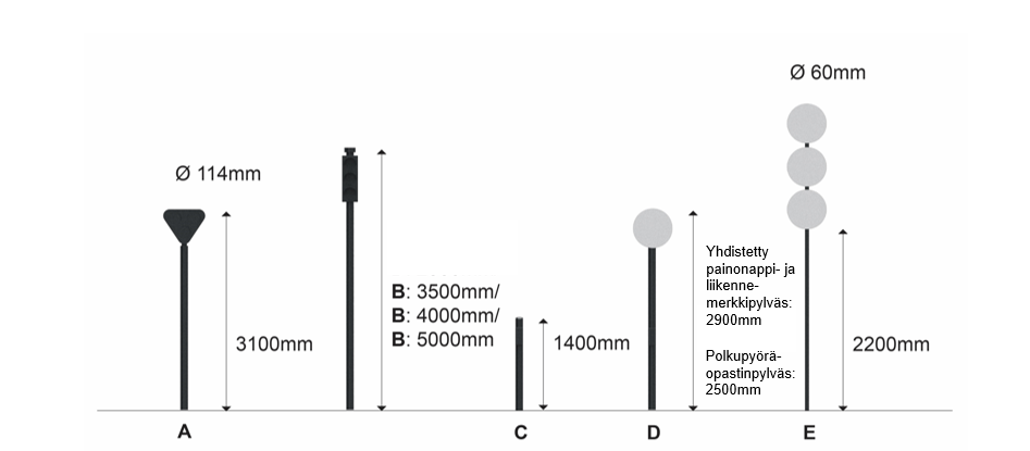 I7 HKI Liikennemerkkipylväät ja liikennevalopylväät. Käytön ohjeistus löytyy Helsingin kaupungin ulkovalaistuksen suunnitteluohjeesta. Mallit ovat Helsingin omat. Maalattuihin pylväisiin kiinnitettävät liikennemerkkipannat on maalattava pylvään rungon kanssa samalla värillä. Liikennevaloissa käytetään alumiinista liikennevalohattua.