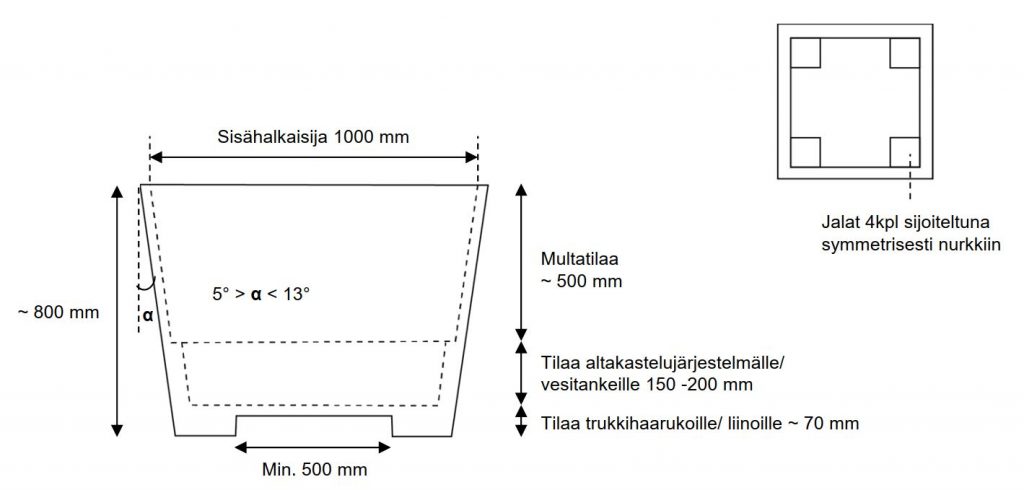 Mallitiedot: Istutusastia on valmismalli. Tuotteen tulee olla vapaastiseisova, pinoutuva sekä siirreltävissä koneellisesti mm. trukkihaarukalla ja liinoilla. Astian tulee kestää koneellisesta siirrosta aiheutuvat kolhut sekä ilmaston vaihtelun ja ilkivallan aiheuttamat rasitukset. Astian yläreunan tulee olla niin kapea, ettei se houkuttele istumaan, mutta se ei saa estää kasvien vapaata kasvamista reunan ylitse.
