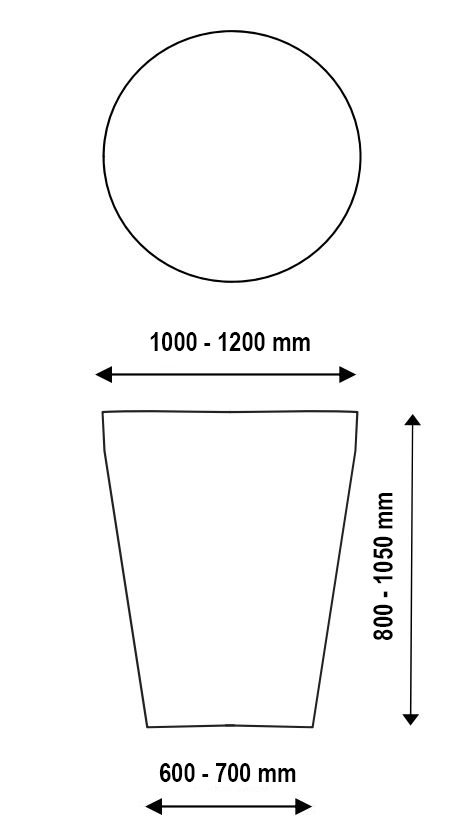 Mallitiedot: Istutusastia on valmismalli. Astia on varustettava altakastelujärjestelmällä ja aluslautasella. Astian tulee olla nostolaitteella liikuteltavissa ja tyhjennettävissä. Kuvan muoto ja mitoitus on suuntaa antava. Historiallisilla alueilla voidaan valita aikakaudelle tyypillinen malli.