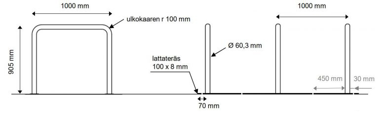 Mallitiedot: Kaaritelineyhdistelmässä on kolme kaaritelinettä kiinnihitsattuina maalattateräksiin. Lattaterästen reunat ja hitsaussaumat ovat siistit ja viimeistellysti hiotut. Peräkkäiset kaaritelineyhdistelmät asennetaan niin, että kaaritelineet ovat 1000 mm välein. Telineyhdistelmä kiinnitetään alustaan telineiden päistä ja väleistä. Kiinnitysreikien paikat on esitetty kuvassa.