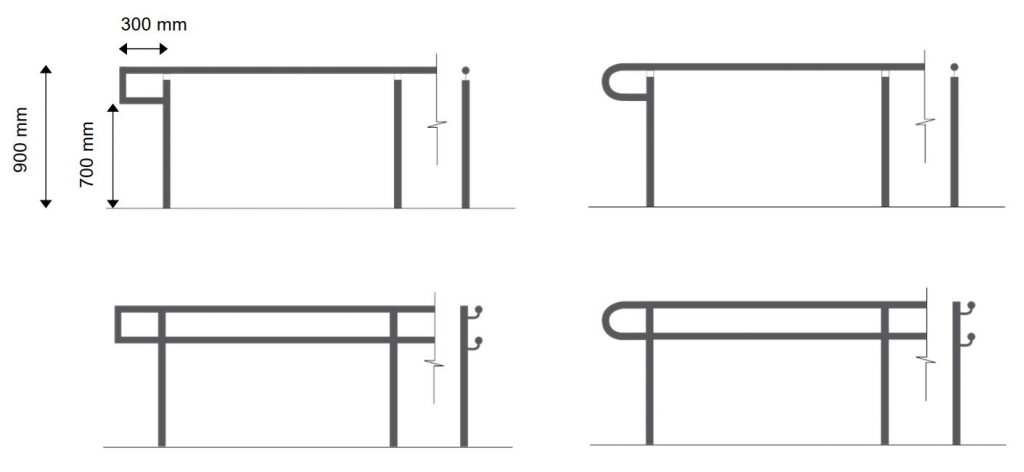 Mallitiedot: Käsijohdetta käytetään portaissa ja luiskissa maahan, seinään tai muuriin asennettuna. Esteettömyyden perustasolla käytetään yhtä, 900 mm korkeudelle sijoittuvaa käsijohdetta. Erikoistasolla käytetään kahta, 900 mm ja 700 mm, korkeudelle sijoittuvaa käsijohdetta. Mallisto on Helsingin oma. Käsijohteen päättämiseen on kaksi muotovaihtoehtoa, suoralinjainen ja pyöristetty.