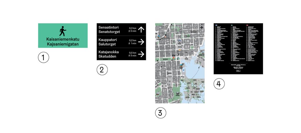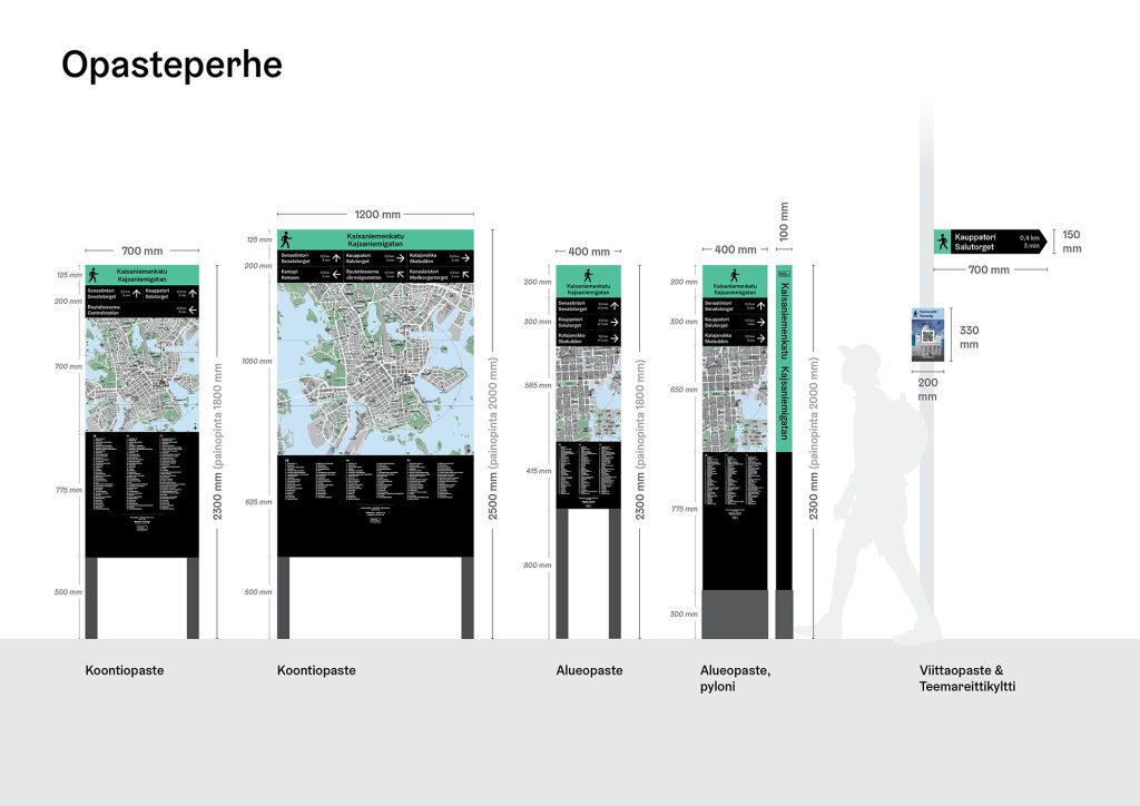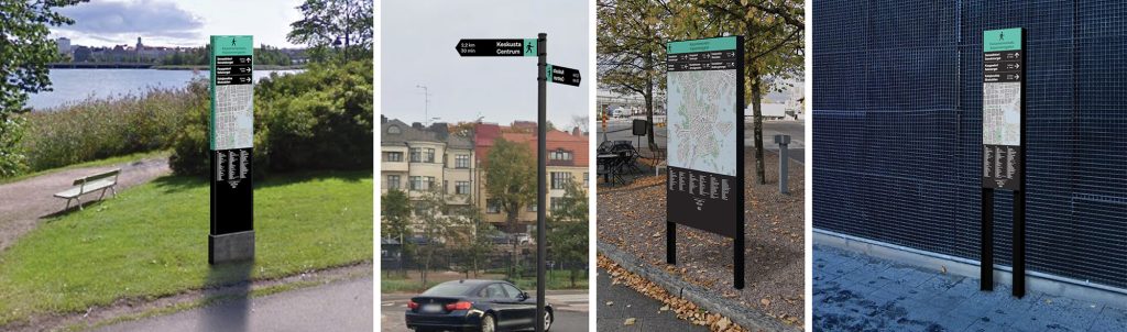 Havainnekuvia opasteluonnoksista (opasteiden sijainnit ovat viitteelliset)