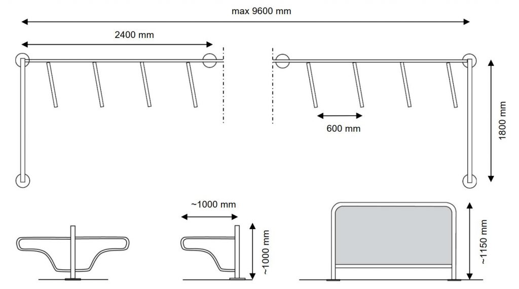 Mallitiedot: Pysyväksi tai kausikäyttöön tarkoitettu valmismalli. Telineessä on sekä kolo eturenkaalle että runkolukitusmahdollisuus. Piirros ohjeistaa mitoitusta, ei mallia. Telinettä voidaan käyttää yksi- tai kaksipuoleisena kiinteänä telinerivinä sekä vaihtoehtoisesti päätyjen kanssa aitauksena esim. ajoradan reunassa. Teline voidaan tarvittaessa asentaa kiinteästi.