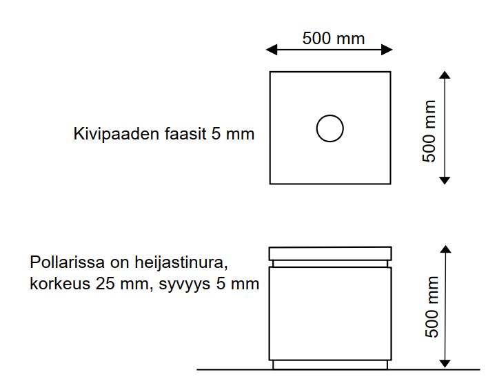 Mallitiedot: Kivipollari tilataan valmistajalta oheisten mittojen mukaan. Myös lähellä oheista mitoitusta olevia valmismalleja voidaan käyttää. Pollariin voidaan kiinnittää liikennemerkin pylväs.