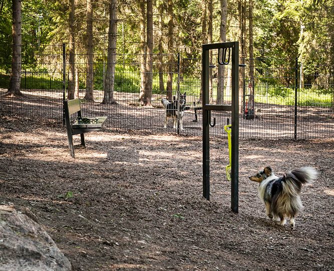 - Kaksiosaisten aitaus, tavoitekoko 3000 m², josta pienten koirien puoli > 600 m².
