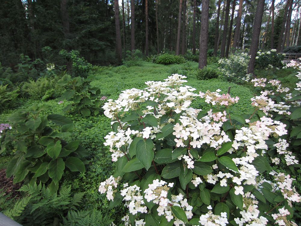 Haagan alppiruusupuisto on metsäpuutarha, jonka mäntyjen katveessa kukkivat myös monet hortensiat.