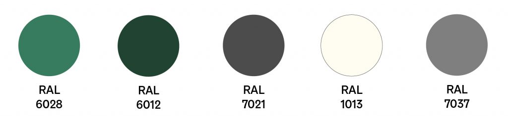 RAL 6028, Pine Green , RAL 6012, Black Green, RAL 7021, Black Grey, RAL 1013, Oyster White sisäkatto, RAL 7037, Dusty Grey ulkokatto