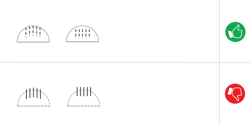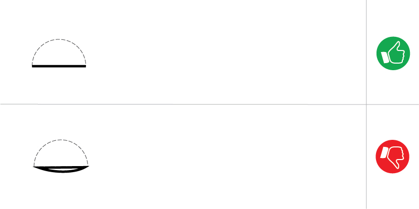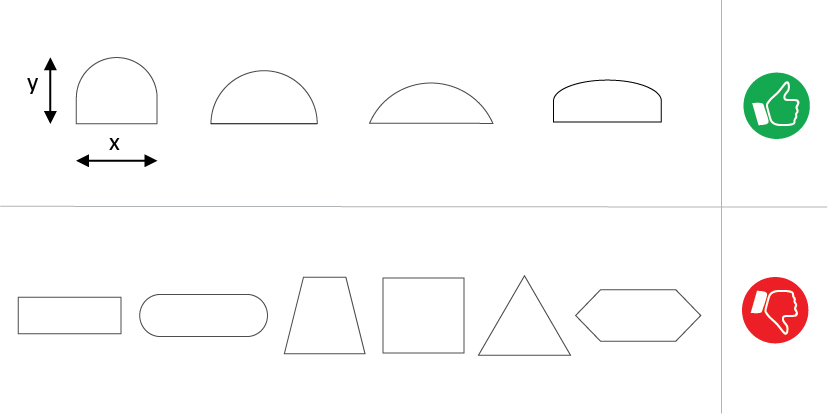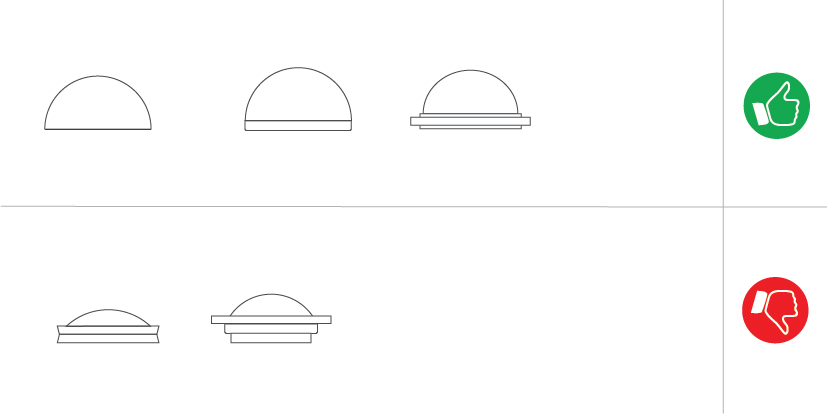 HYVÄKSYTTÄVIÄ muotoja ovat kupolin, puolipallon ja kalotin muotoiset tai tätä muotoa mukailevat valaisimet. Valaisinten hyväksytyt mittasuhteet on esitetty kohdan 3 kuvissa.