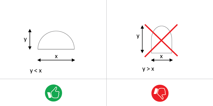 HYVÄKSYTTÄVÄ valaisinkuvun leveyden (x) ja korkeuden (y) suhde: y ≤ x ja y ≥ 150 mm