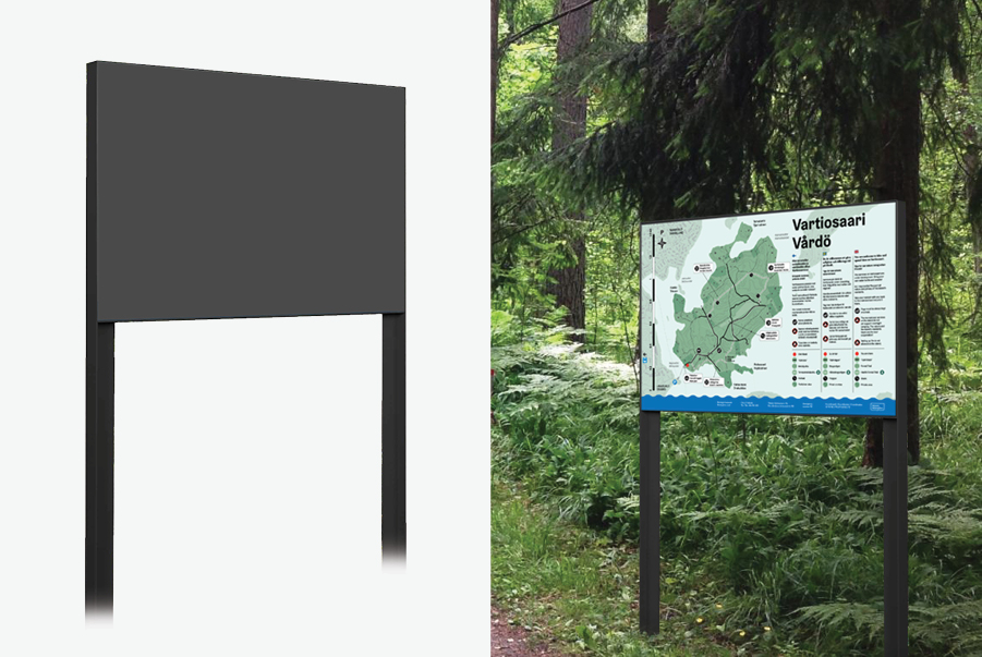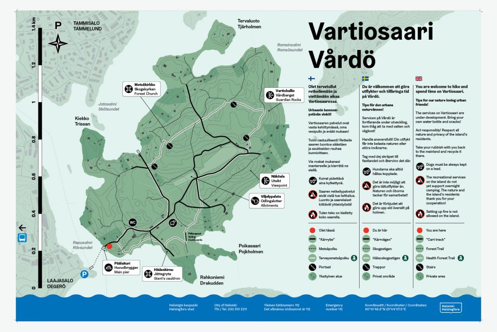 Vartiosaaren karttaopaste. Kartan, reittien ja kohteiden lisäksi opasteessa esitetään yleiset ohjeistukset ja vinkit kohteessa vierailuun sekä yhteystiedot (koordinaatit), puhelinnumero (Helsingin kaupunki), ja hätänumero.
