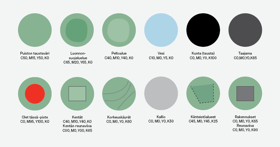 Opaskartan värit perustuvat osittain Helsingin kaupungin visuaaliseen ilmeeseen. Kartassa käytetyt väriarvot ovat tarkasteltavissa kuvassa Taustakartan värisävyt.