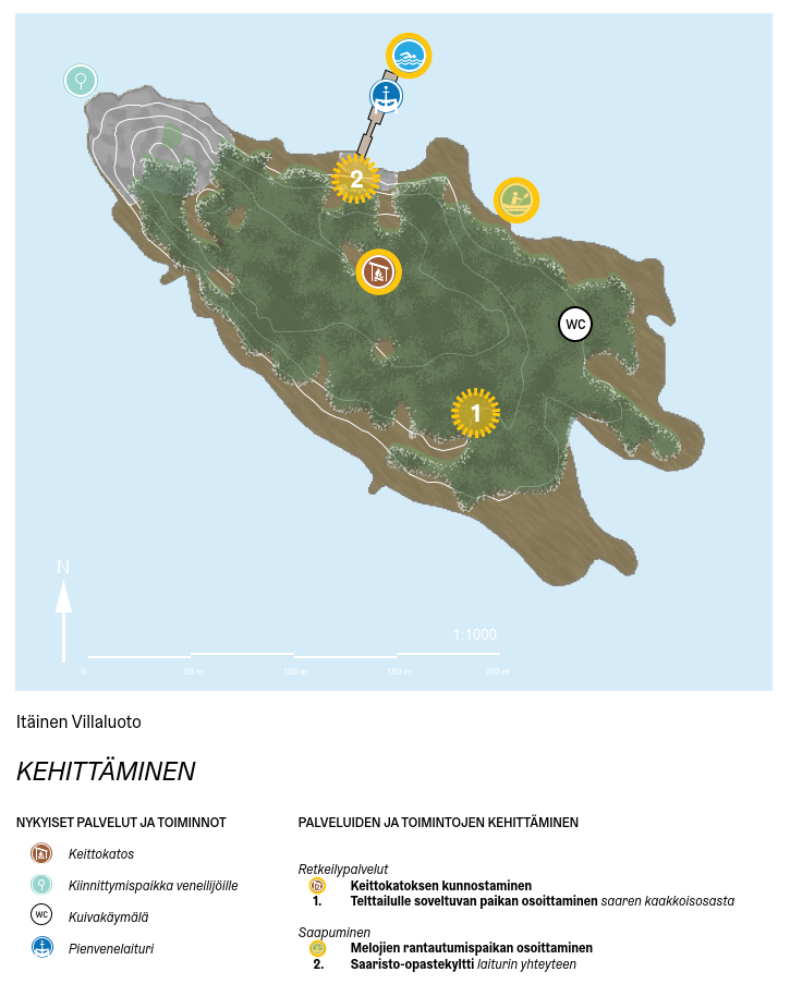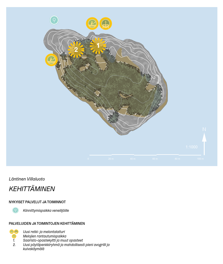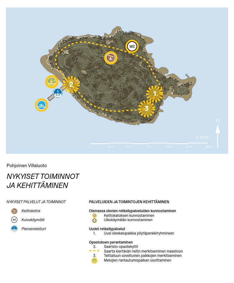 - Pohjoisen Villaluodon retkeilypalveluja parannetaan: keittokatos ja ulkokäymälä kunnostetaan ja kaakkoisosaan rakennetaan uusi oleskelupaikka pöytäryhmineen.